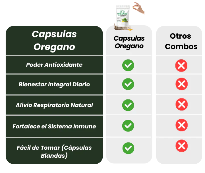 Cada cápsula combinaaceite de oréganode alta concentración conaceite de semilla negra (Nigella Sativa)prensado en frío. Ambos son conocidos por sus propiedades antimicrobianas, antioxidantes y de apoyo inmunológico.