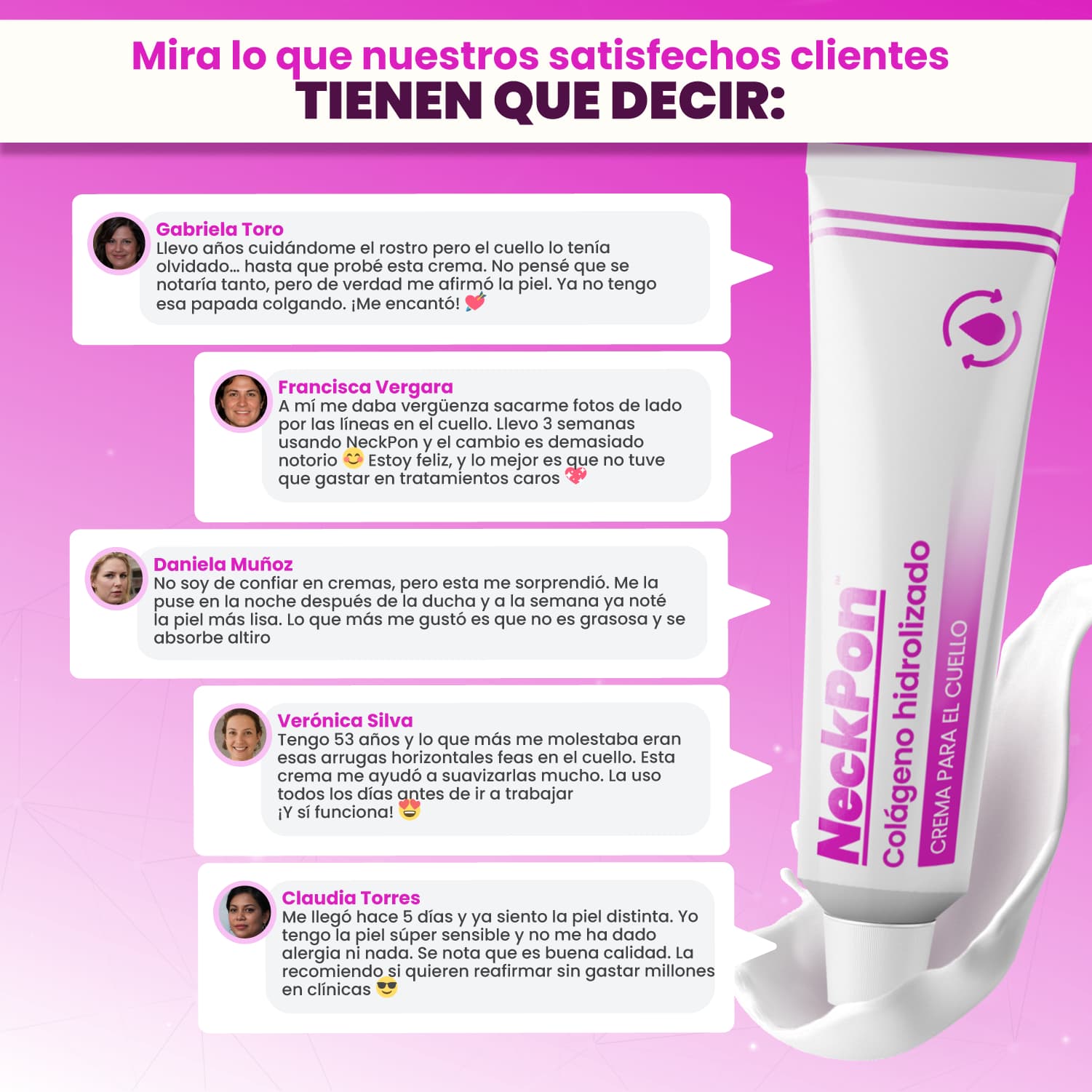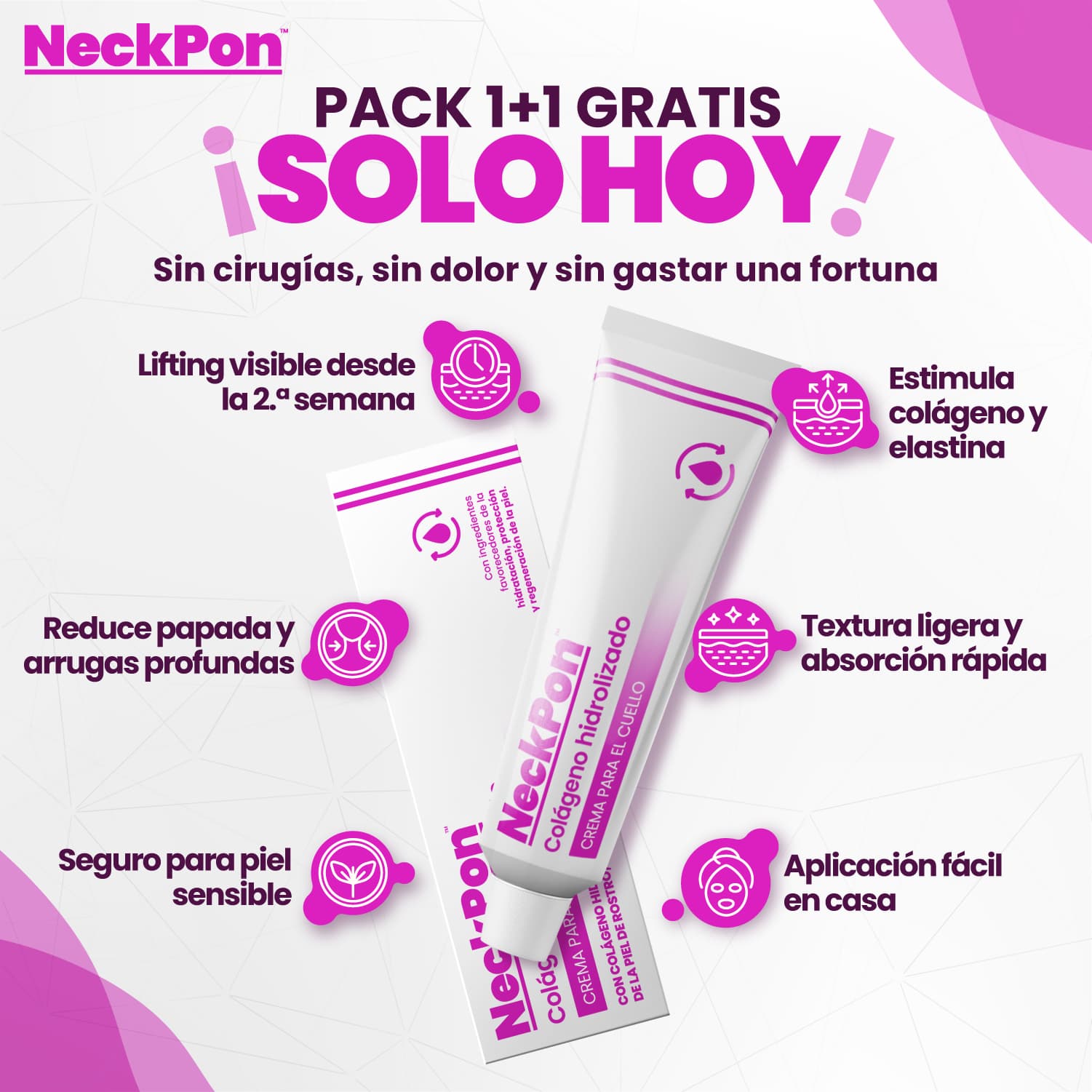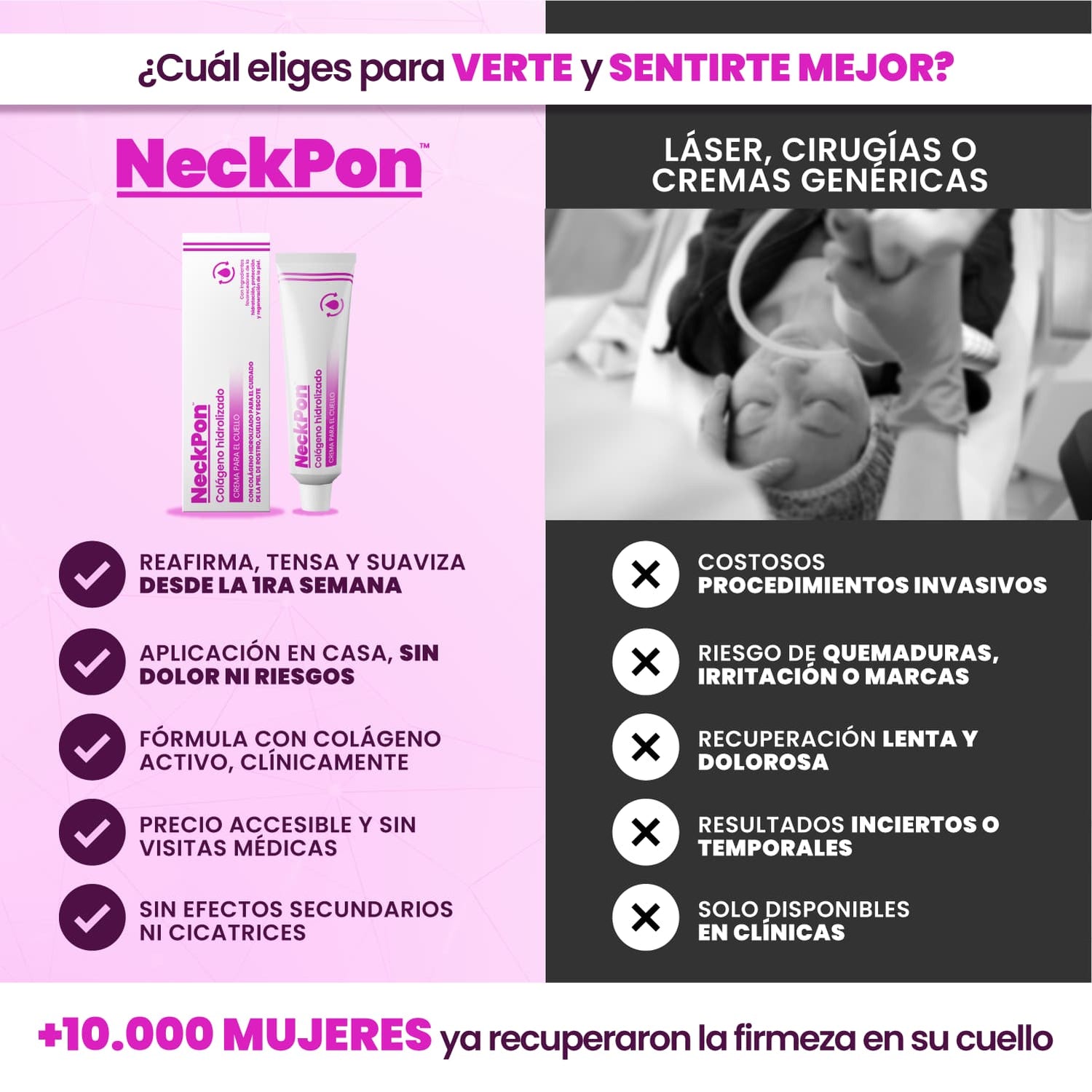 Con el tiempo, la piel del cuello pierde firmeza, aparece papada, líneas marcadas y la textura se vuelve más frágil. La mayoría de las cremas no penetran lo suficiente, los masajes no sirven y las cirugías son dolorosas, costosas e invasivas.